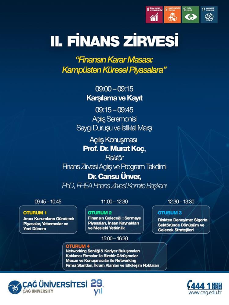Bölümümüz lisans öğrencileri için 21 Nisan 2026 tarihinde Çağ Üniversitesi düzenlenecek II. Finans Zirvesine katılım amacıyla ulaşım organize edilmiştir. Etkinlik; finans sektörü temsilcileriyle bir araya gelme, güncel gelişmeleri takip etme ve kariyer odaklı networking fırsatı sunmaktadır.